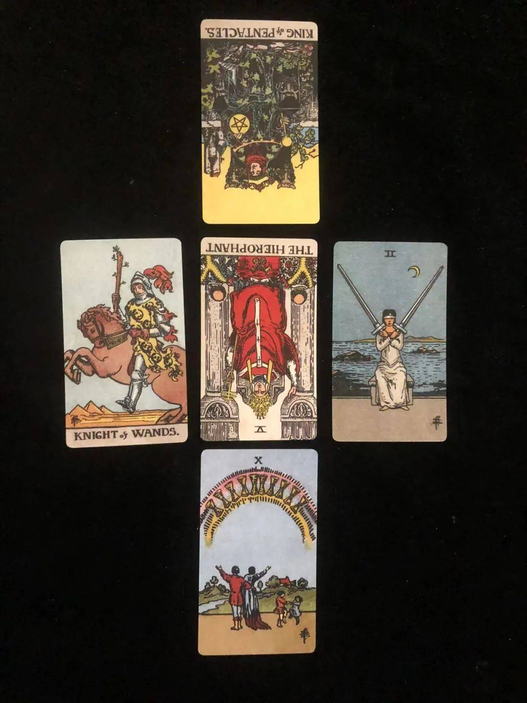 权杖骑士正位,圣杯十正位,宝剑二正位,星币国王逆位,教皇逆位